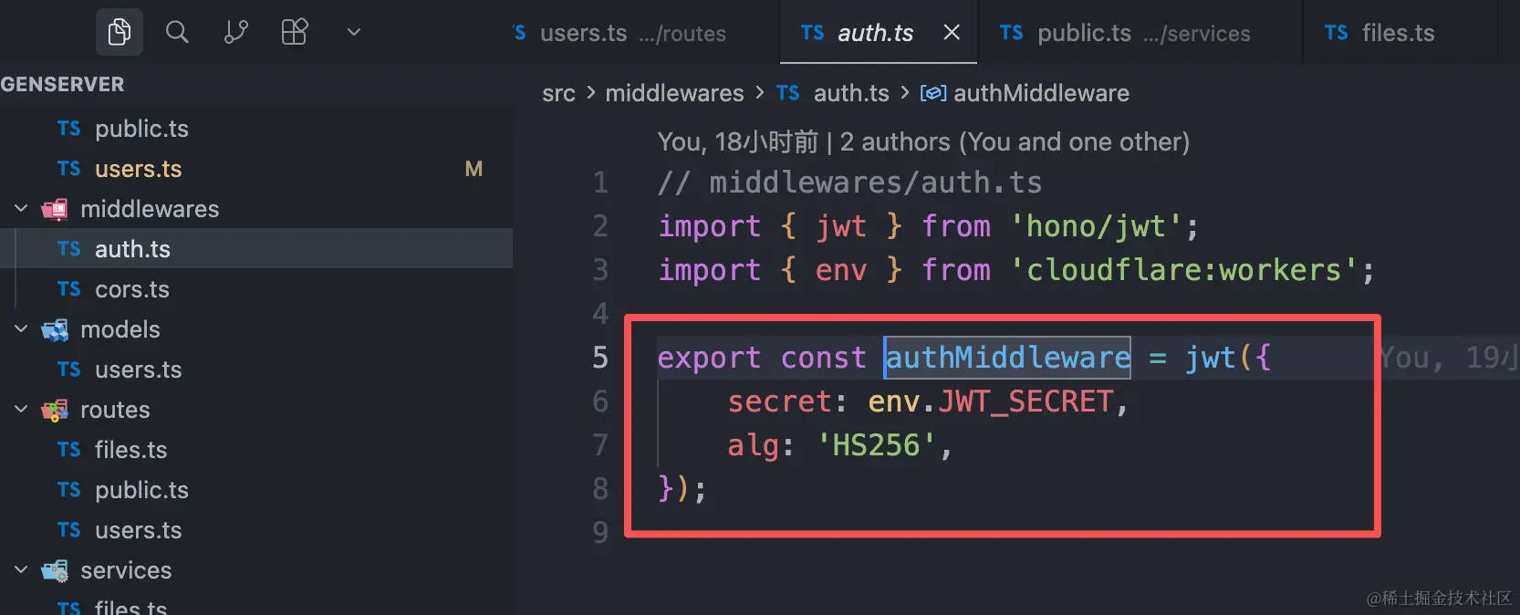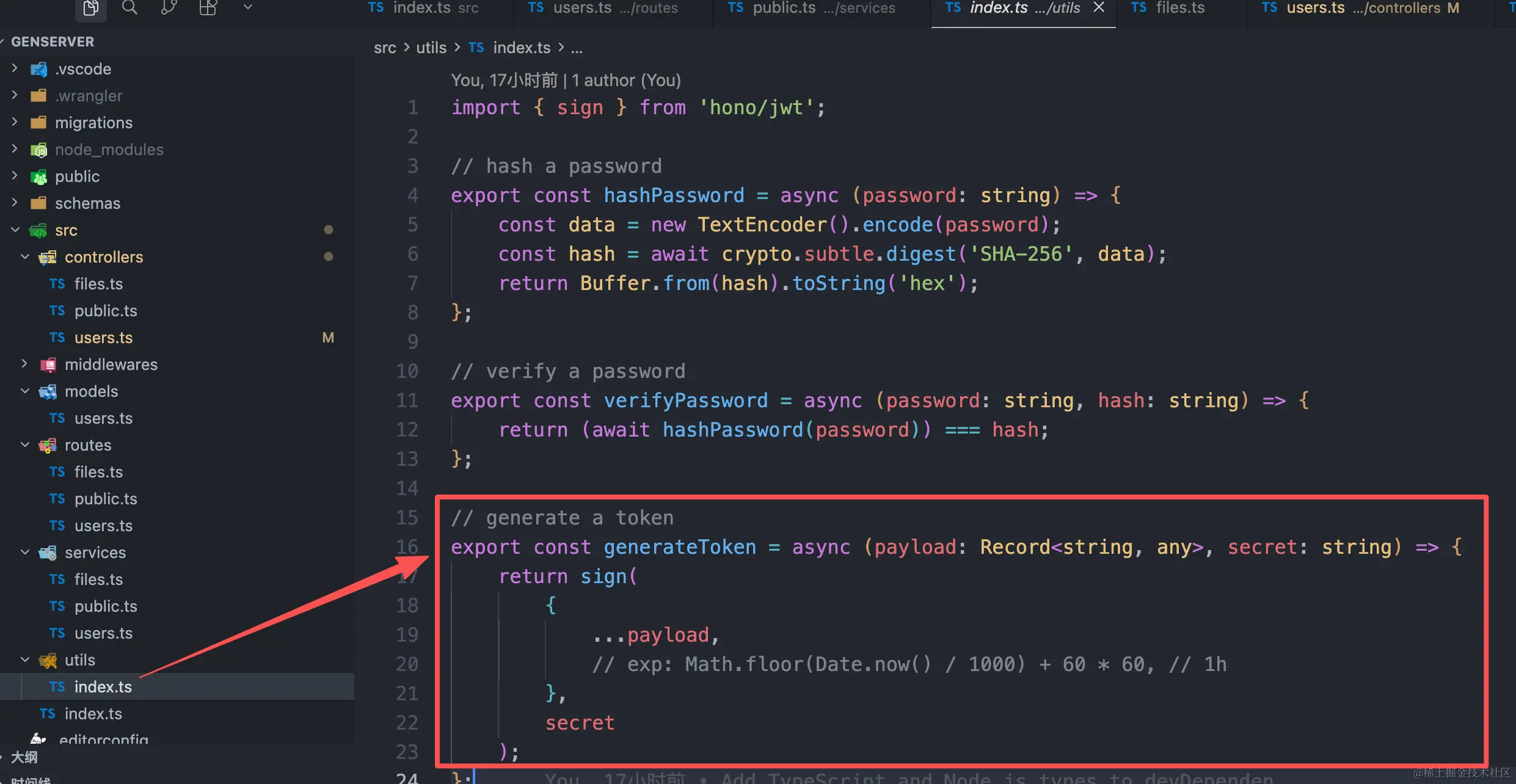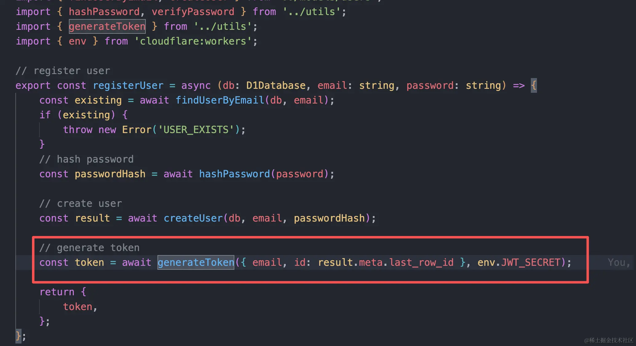 首先是用jwtToken生成token,这个jwt是在hono中已经集成好了得,直接引入即可使用,使用的时候传入要认证的信息和密钥即可,生成token逻辑: