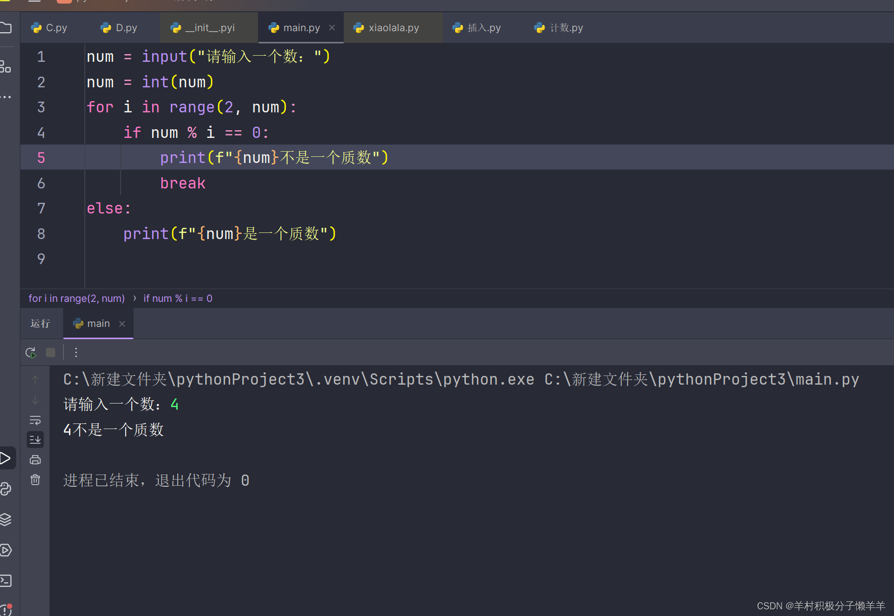 再判断这个数是否被i整除,挨个对i进行整除,如果能被整除就用breaker跳出循环