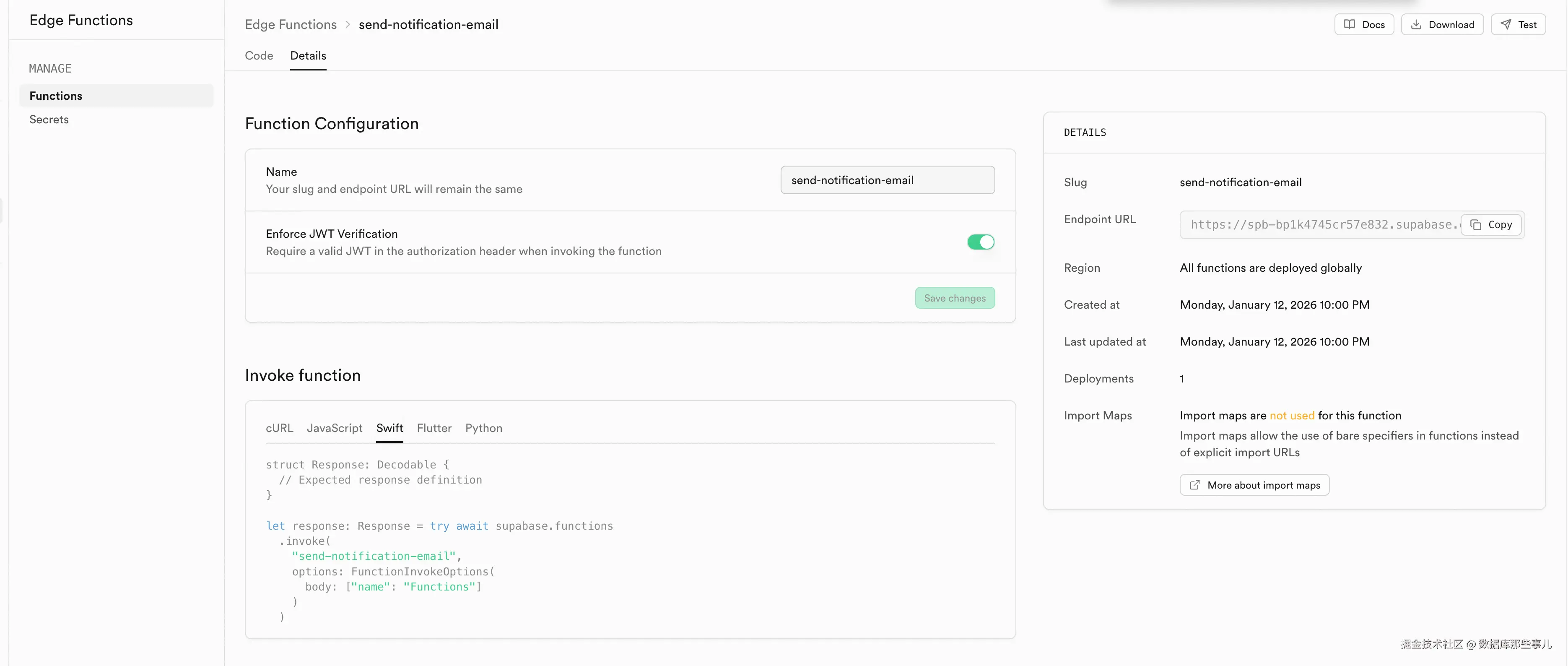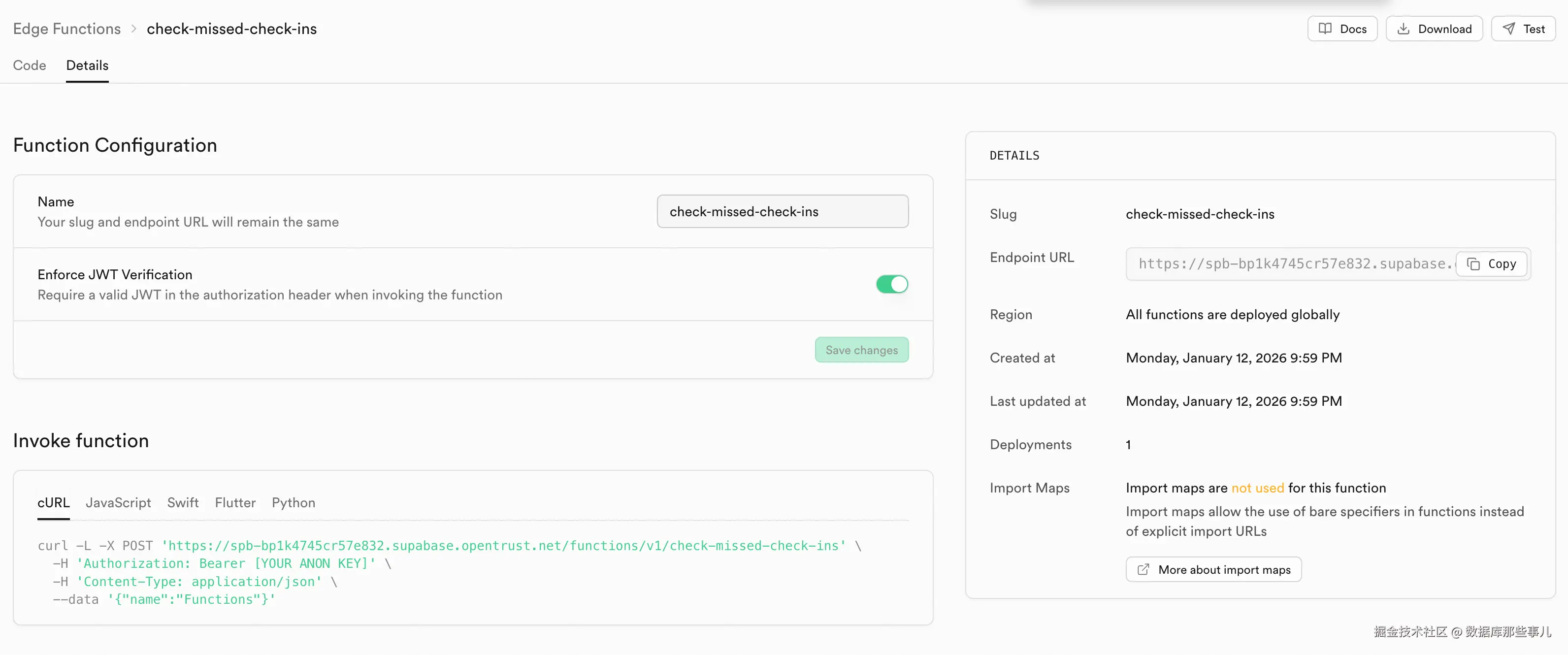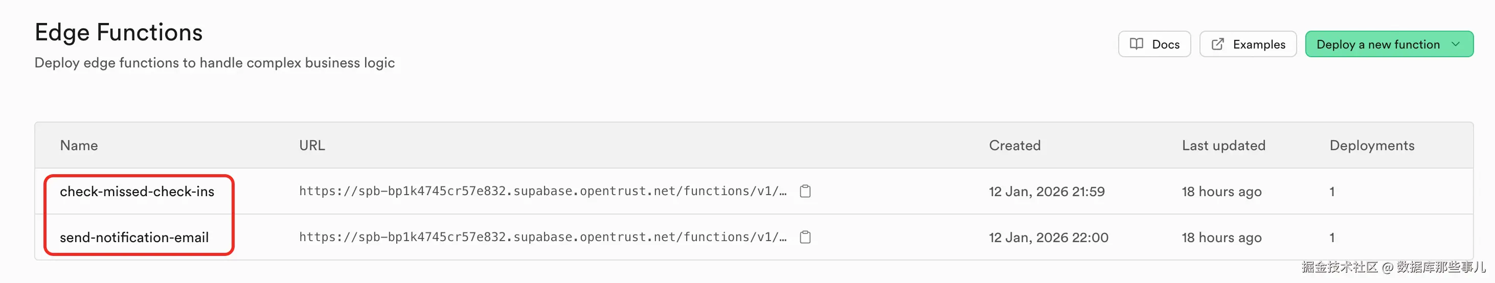 这里我们实现了两个Edge Function:check-missed-check-ins和send-notification-email。
