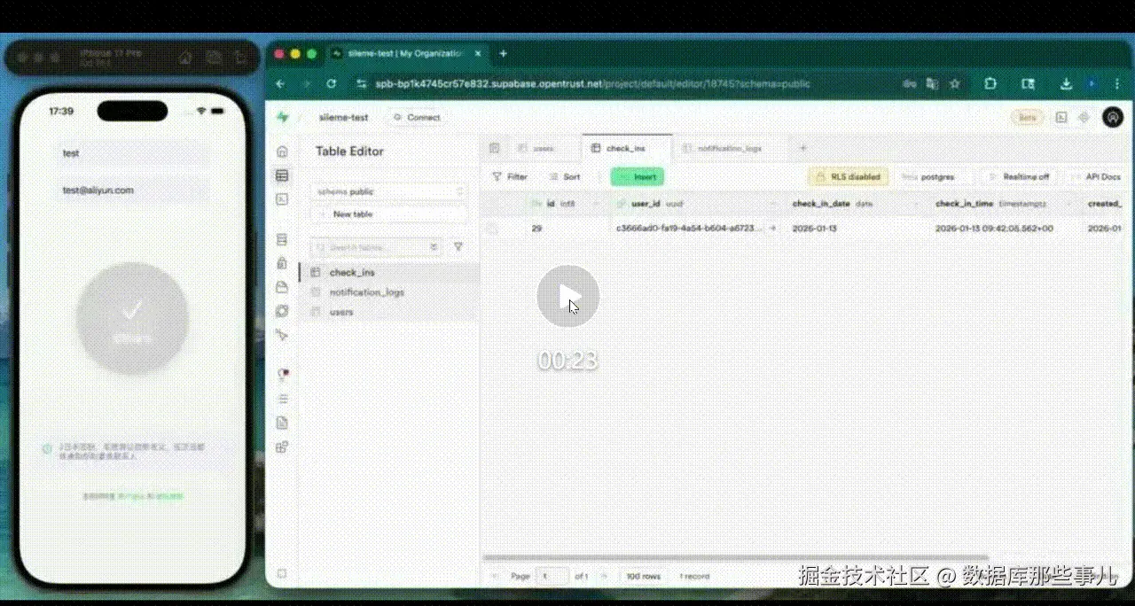 看下面的视频,左边我们使用模拟器模拟了真机效果,右边是Supabase后端dashboard,可以看到刚开始后端并没有数据,当我们通过左边APP完成签到后,数据写入到了后端的users和check_ins表里。