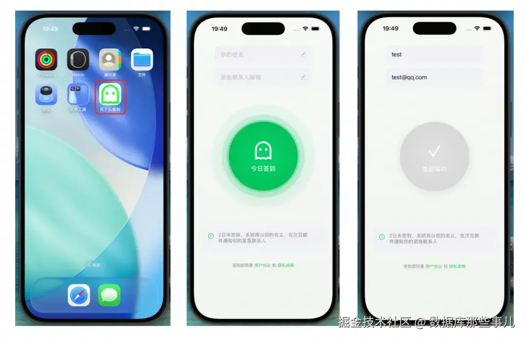 当完成签到后,签到数据会存储在后端,在重复打开APP时,会从后端获取签到数据,如果已经完成签到,则直接显示签到成功。如果2天没签到则触发邮件发送任务。