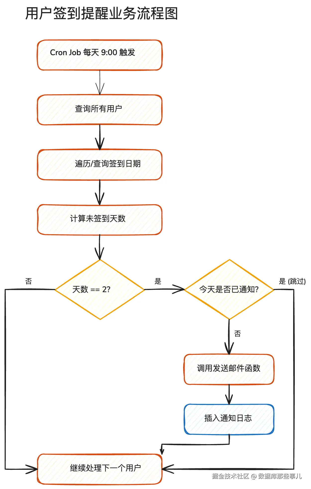 目标:每天扫描所有用户,找出"连续 2 天未签到"的用户,并触发通知流程。