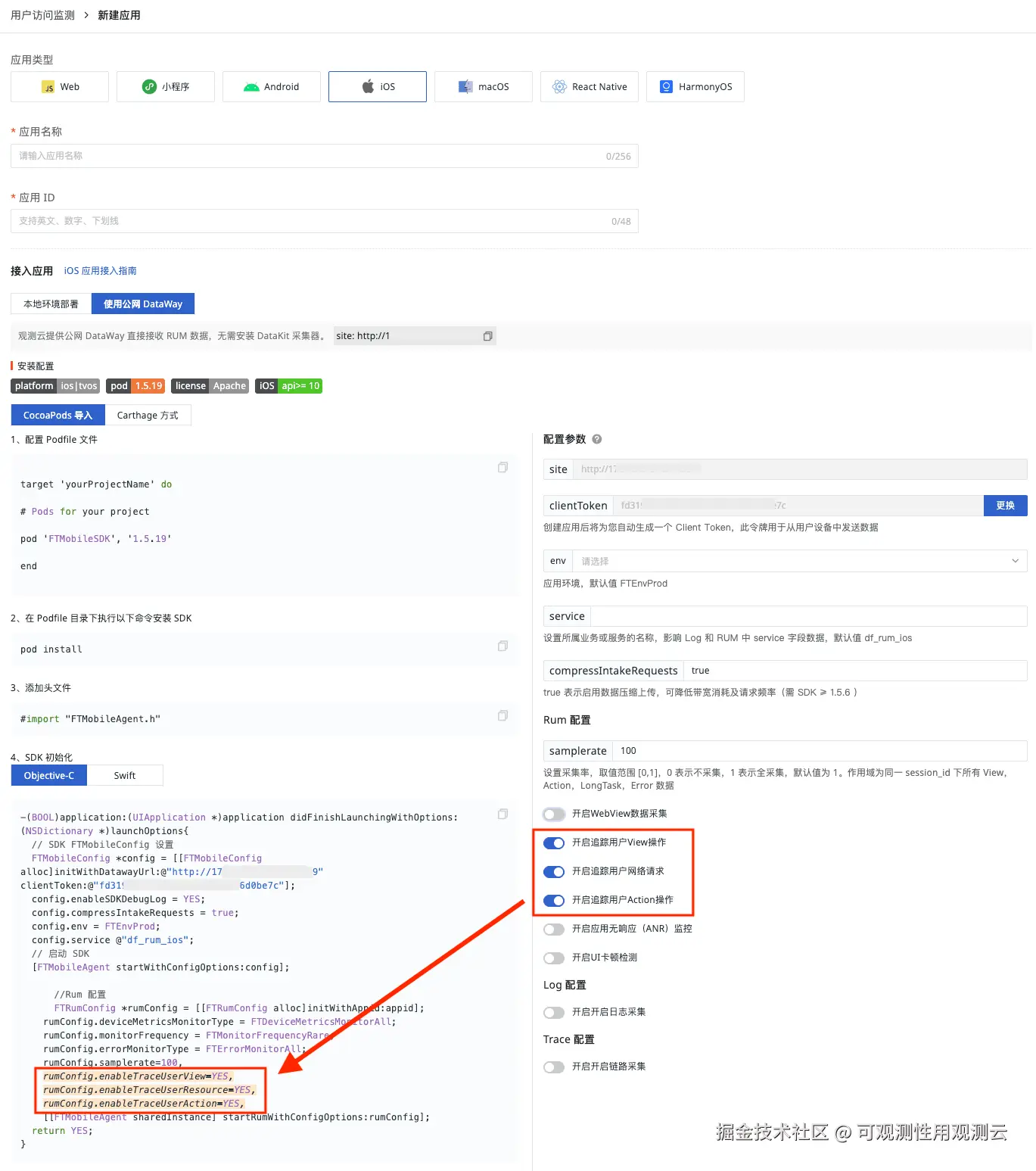 扩展 Android、iOS、React Native 的 SDK 接入配置,新增 RUM、链路、日志的高阶功能配置项,并在其被修改时提供明确的高亮提示。