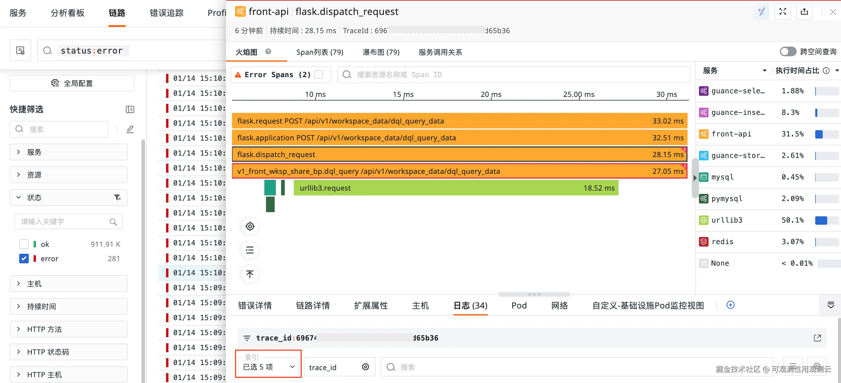 2、链路 > 详情页:关联日志:优化索引筛选功能,默认选中当前链路内所有关联服务的全部索引。