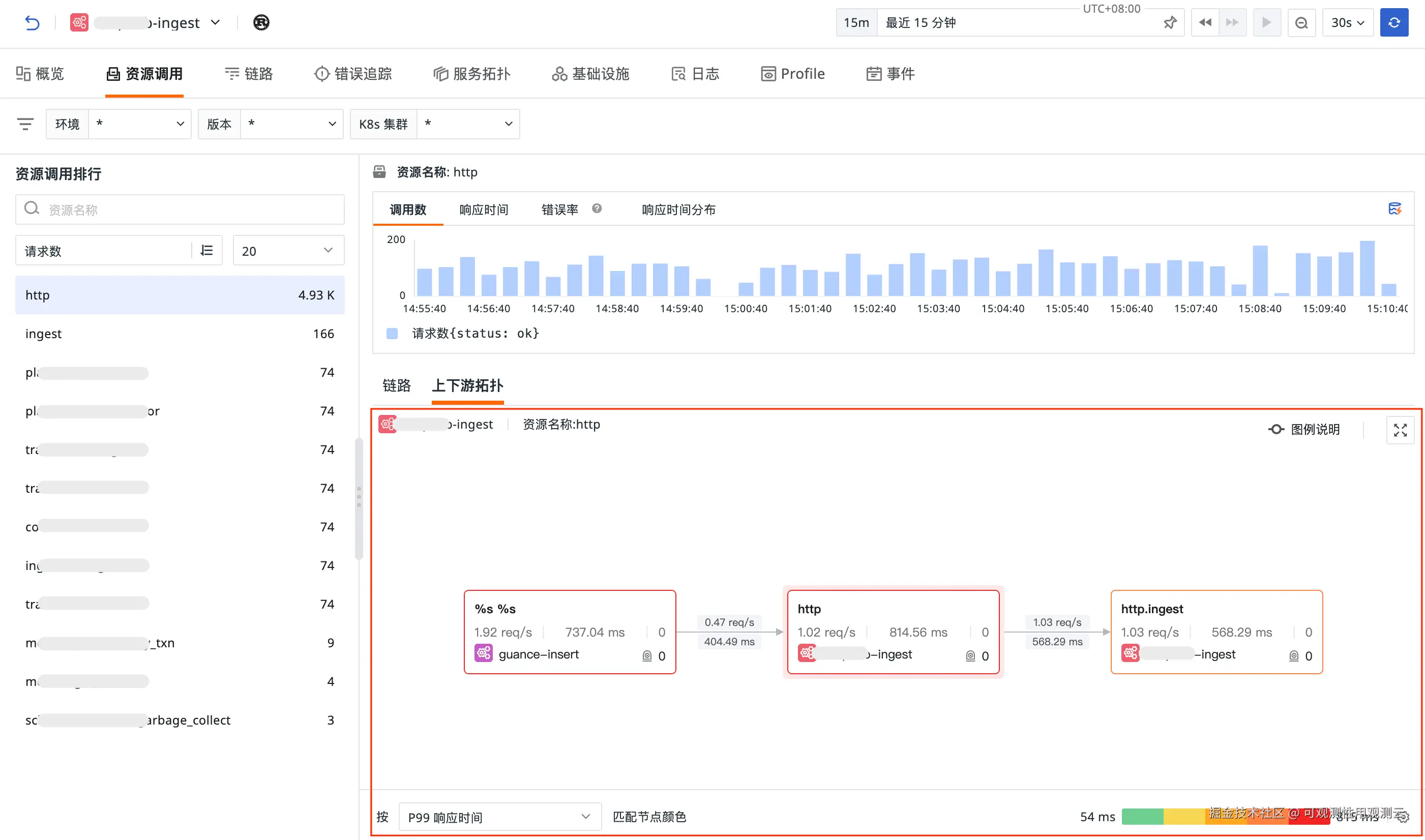 - 连线显示指标:连接线上直接展示请求数、P99耗时、错误率,并配有图例说明。