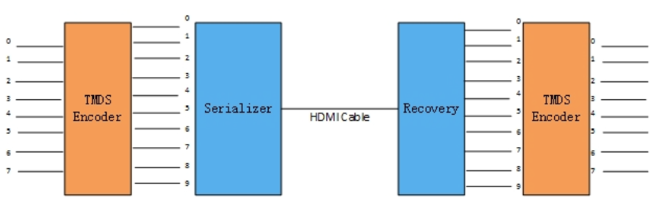 如果是8bit的数据进入TMDS编码器,得到抗干扰性强的10bit TMDS信号,然后再进行串行化输出;在接收端收到串行的HDMI信号后,进行信号复原,得到10bit的TMDS信号,最后用TMDS解码器解码得到原来的8bit数据。