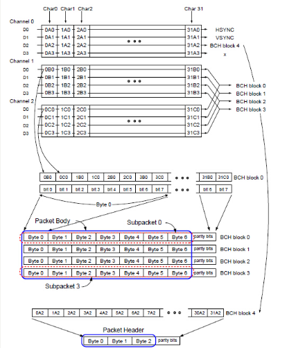 - 包头部是BCH block 4,由Channel0[2]传输,32clk表示有32bit,则为4byte,前三个byte为包头,最后一byte为校验码