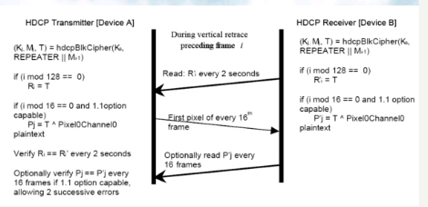 此后的每一帧,Transmitter与Receiver都会运行一次hdcpBlockCipher,不过参数为上次生成的Ks与M,生成的新参数为Ks,M,T