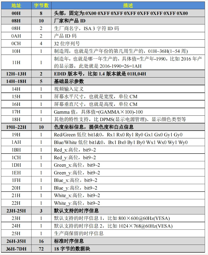 EDID 前 128 个字节的含义如表所示: