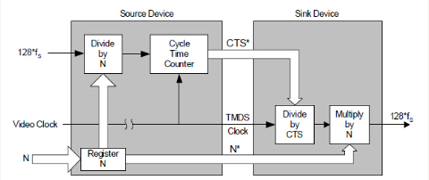 在接收设备这端,TMDS clock通过硬件设备可以得到,N与CTS通过Audio Packet传输过来,求fs: