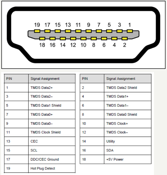 - 19为Hotplug(热插拔)引脚:用于检测HDMI设备有没有存在,如果存在(Hotplug为High)那么可以通过DDC去读EDID),HDMI有规定在HDMI 5vAC断电时source device可以读reciever device的EDID,也就是需要Hotplug为High。其中有两种Hotplug相关的情况会导致HDMI被识别为DVI: