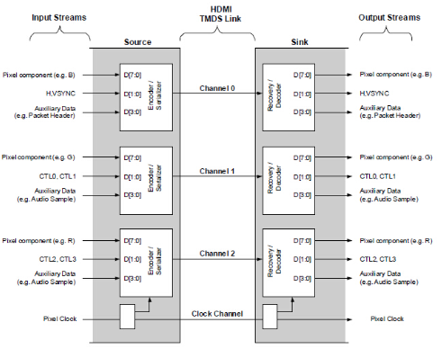 HDMI的数据传输有TMDS0、TMDS1、TMDS2三个通道,每个通道的传输流程都是一样的。