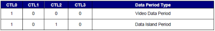 3、如果是Preamble传输,则占用1,2两个通道共4bit输入,Channel1[1:0]与Channel2[1:0]分别为CTL0,CTL1,CTL2,CTL3,用于判断接下来输入的是Video Data或者Data Island