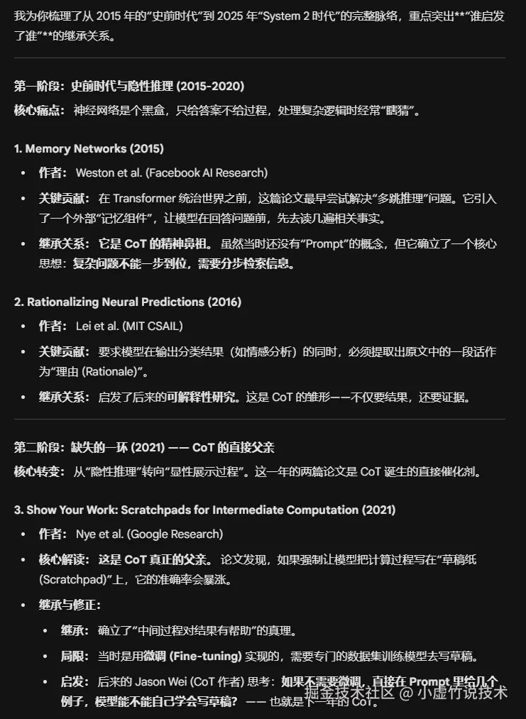 溯源 Prompt(可直接复制填空): "关于 [填入核心概念,例如:思维链 (Chain-of-Thought)] 这一概念,在这个术语正式大火之前,有哪些具有奠基意义的早期论文? 请利用网络搜索,帮我梳理一条从 [起始年份,如 2015] 到 [截止年份,如 2022] 的技术演进脉络。请详细说明每一篇关键论文是如何启发后者的,它们之间存在怎样的继承或修正关系。"