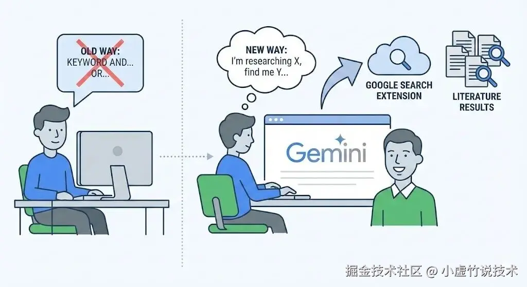 只要你打开了 Gemini 的联网功能(Google 搜索扩展),就可以像和导师聊天一样,直接说明研究背景、研究问题,以及你希望得到什么样的结果。