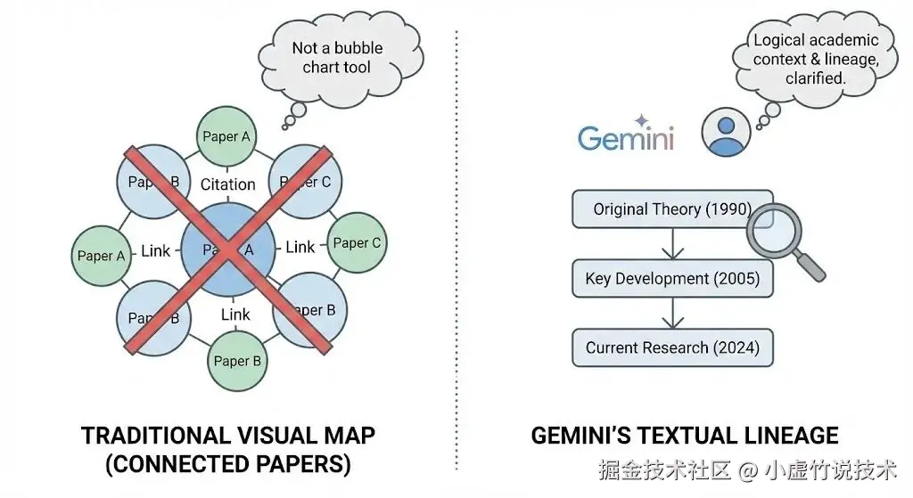 Gemini 虽然没法像 Connected Papers 那样画出炫酷的引用"泡泡图",但说实话,这一点也不耽误我们用它干活 😄。 我们更看重的是它超强的逻辑梳理能力 ,用来搭一份文字版的「学术脉络图」,效率反而更高。