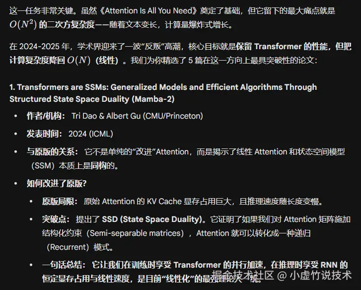 追踪 Prompt(可直接复制填空):"以 [填入经典论文标题,例如:Google 的《Attention Is All You Need》]为核心,请帮我找出 [填入年份范围,如 2024-2025]年引用了这篇文章,并且在 [填入具体细分方向,例如:'计算效率优化'或'线性 Attention']方面做出了最重要突破的 5 篇论文。 请重点告诉我:这些新论文具体是如何改进原版方法的?它们解决了原论文的哪些局限性?"