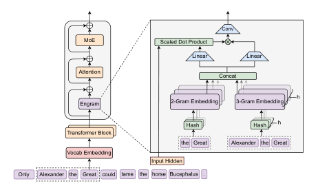 - 提出 Engram:将经典 N N N-gram 嵌入现代化,做到 O ( 1 ) O(1) O(1) 可扩展查表。