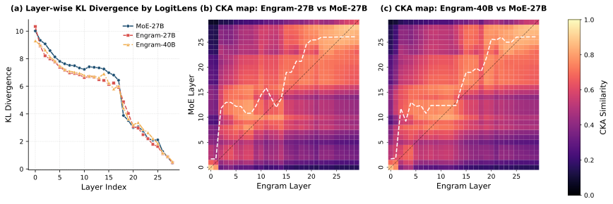 图解:LogitLens 早期 KL 更低,CKA 显示 Engram 浅层对应 MoE 深层,说明"有效深度"变大。
