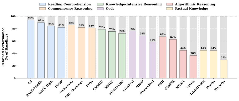 图解:去掉 Engram 后,事实性任务大幅崩溃,而阅读理解保留大多性能,说明事实知识主要由 Engram 承担。
