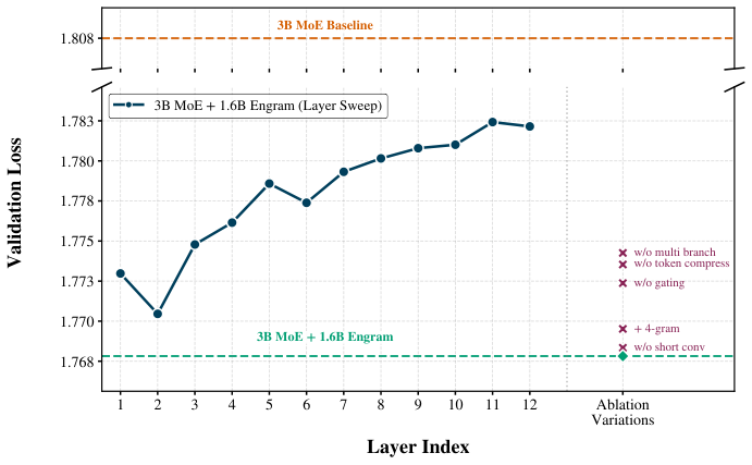 这说明 Engram 把局部模式交给查表后,注意力资源更集中到全局依赖上。
