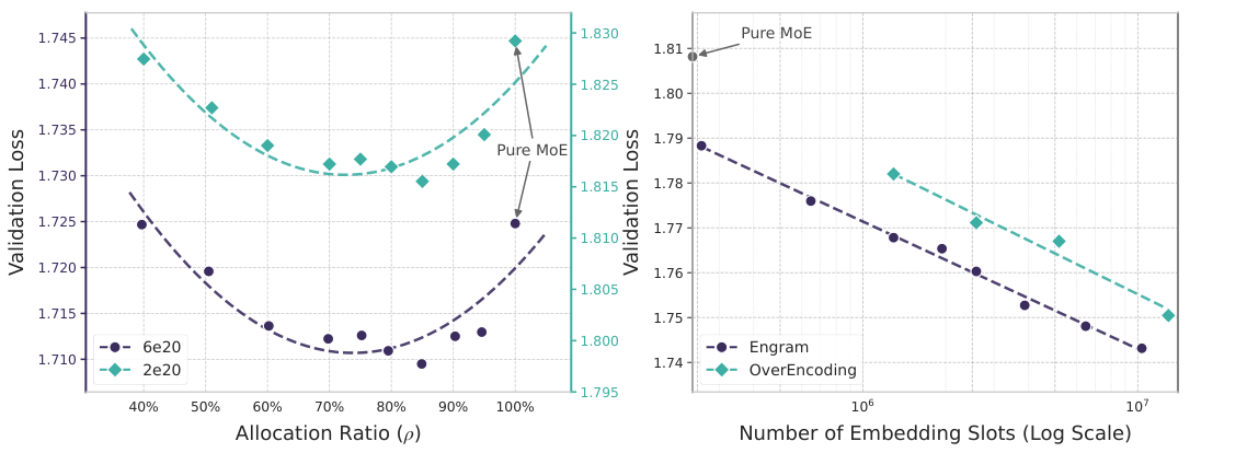 图解:左侧是 allocation ratio ρ \rho ρ 与验证损失的 U 型曲线;右侧是 Engram 在"大记忆"下的对数线性 scaling。