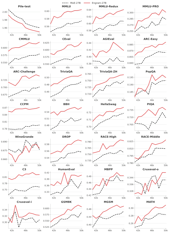 结论非常稳定:Engram 在知识类、推理类、代码数学类全线胜出,且 Engram-40B 还有进一步提升空间。
