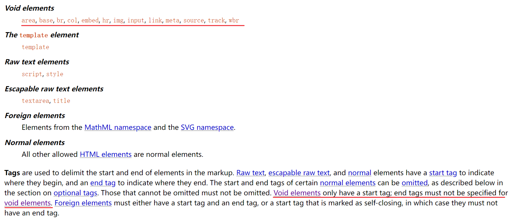 上面提到的 <img> 是 HTML 元素,HTML 允许某些标签是自闭合的(void elements),因为这些元素永远没有内容,所以规范规定它们不能有闭合标签,比如