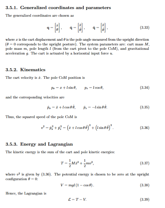 Solving \eqref{eq:cartpole_EL_eq} for accelerations yields the nonlinear dynamics