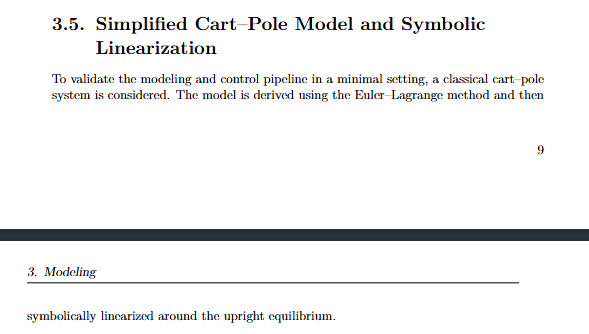 To validate the modeling and control pipeline in a minimal setting, a classical cart--pole