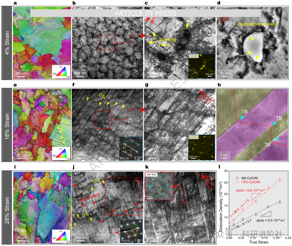 图4.nTiC-CoCrNi合金在低温(87K)下分别变形至总拉伸应变为(a-d)4%、(e-h)18%和(i-k)28%时的代表性变形亚结构