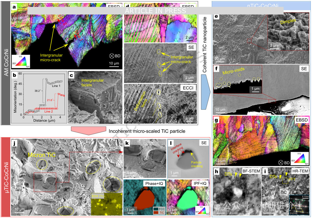 图2.(a-f)nTiC-CoCrNi与(g-i)μTiC-CoCrNi样品的打印态微观结构