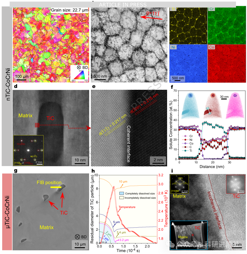 激光中的"溶解-析出"循环:在激光3D打印过程中,TiC纳米层先完全溶解于高温熔池,随后在后续打印层的热循环中重新析出,形成数十纳米大小、与基体原子级匹配的共格析出相。