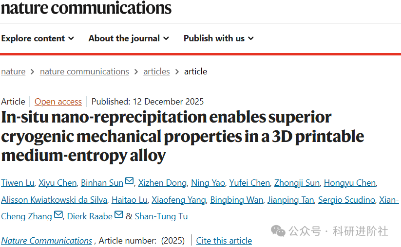 在极端低温环境下,金属材料往往面临强度与韧性难以兼得的困境。尤其是在航空航天、能源存储、深空探测等领域,材料在液氮温度(约 -196℃)下的力学性能直接关系到设备的安全与可靠。近日,一项来自华东理工大学、德国马克斯·普朗克研究所、新加坡ASTAR研究院等国际团队的合作研究,在《Nature Communications》上发表了突破性成果(https://doi.org/10.1038/s41467-025-67279-2),成功通过"原位纳米再析出"技术,显著提升了3D打印中熵合金在低温下的综合力学性能。