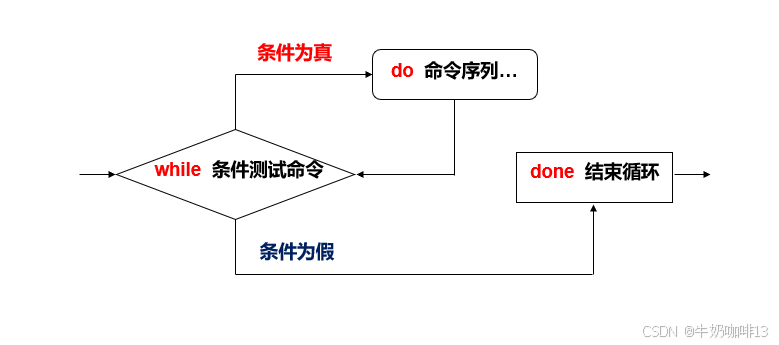 先执行expr,若其退出状态为0,就执行循环体,执行到关键字【done】后,就回到循环顶部,while命令再次检查expr的退出状态。以此类推,循环将一直继续下去,直到exr的退出状态为非0为止。执行流程图如下: