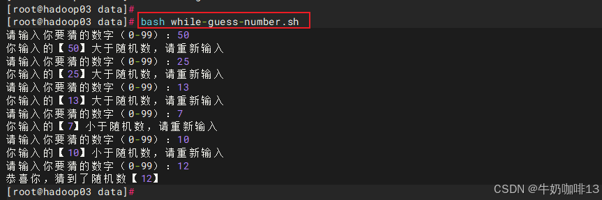 #使用永真循环(while :),条件退出(break)的方式是接收用户的猜测并进行判断
