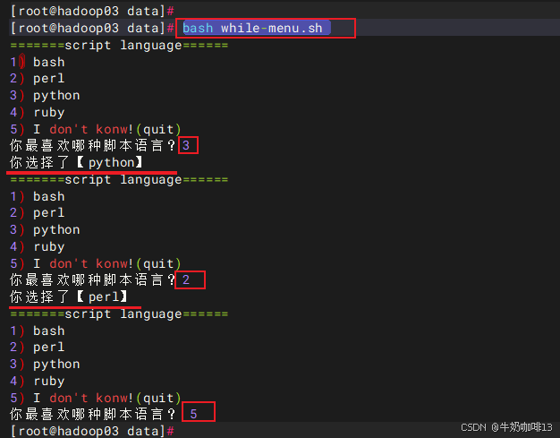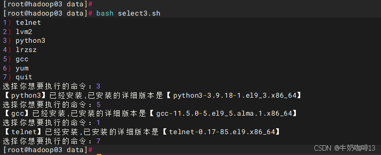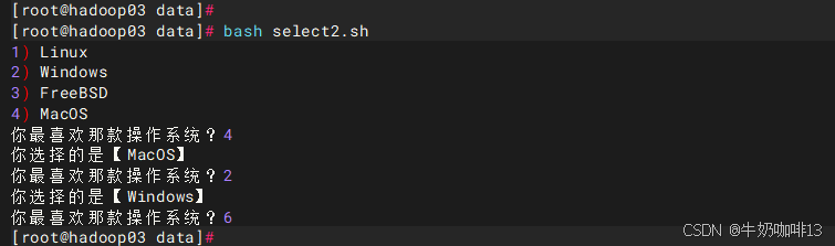 ②select循环的退出【ctrl+c 强制退出】【直接在循环体内用break命令退出】【用exit命令终止脚本】。