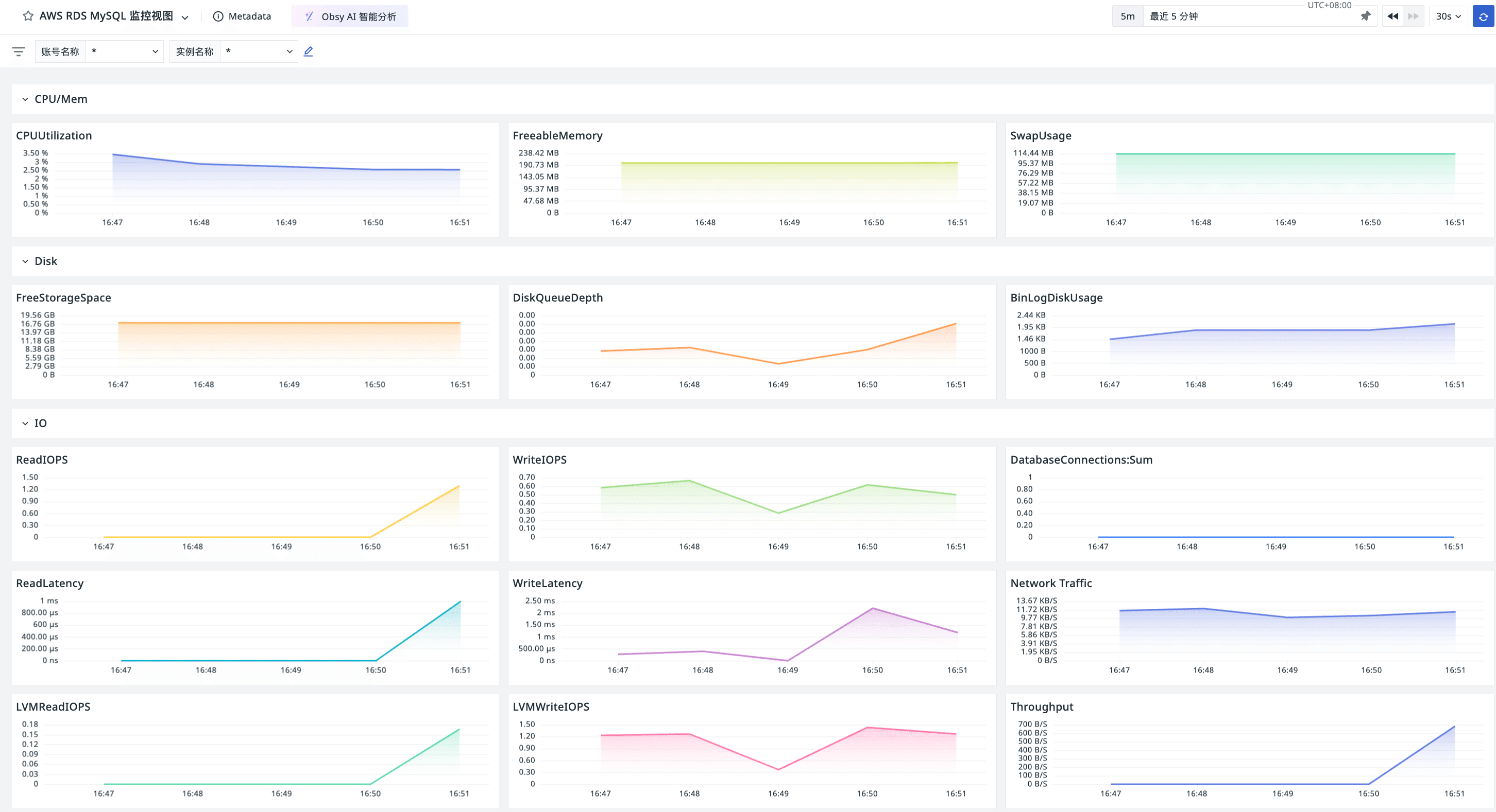 通过将 AWS RDS 的原生监控数据集成到观测云平台,用户可以实现对关系数据库服务(RDS)实例的实时性能监控、资源使用分析以及安全事件的可视化。观测云平台提供的高级分析和可视化功能,包括实时仪表板、智能告警和根因分析,能够帮助用户快速定位数据库性能问题、优化资源成本,并确保数据的高可用性和安全性。