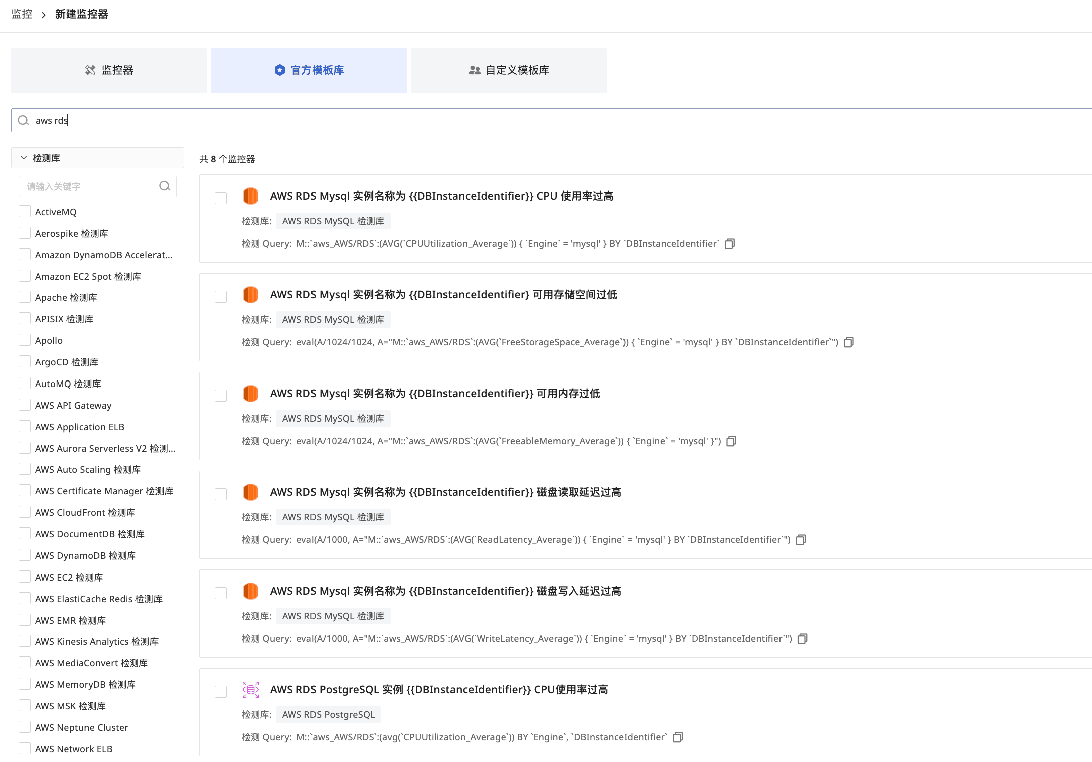 登录观测云控制台,点击「监控」 -「新建监控器」,输入 "AWS RDS", 选择对应的监控器,点击 "确定" 即可添加。