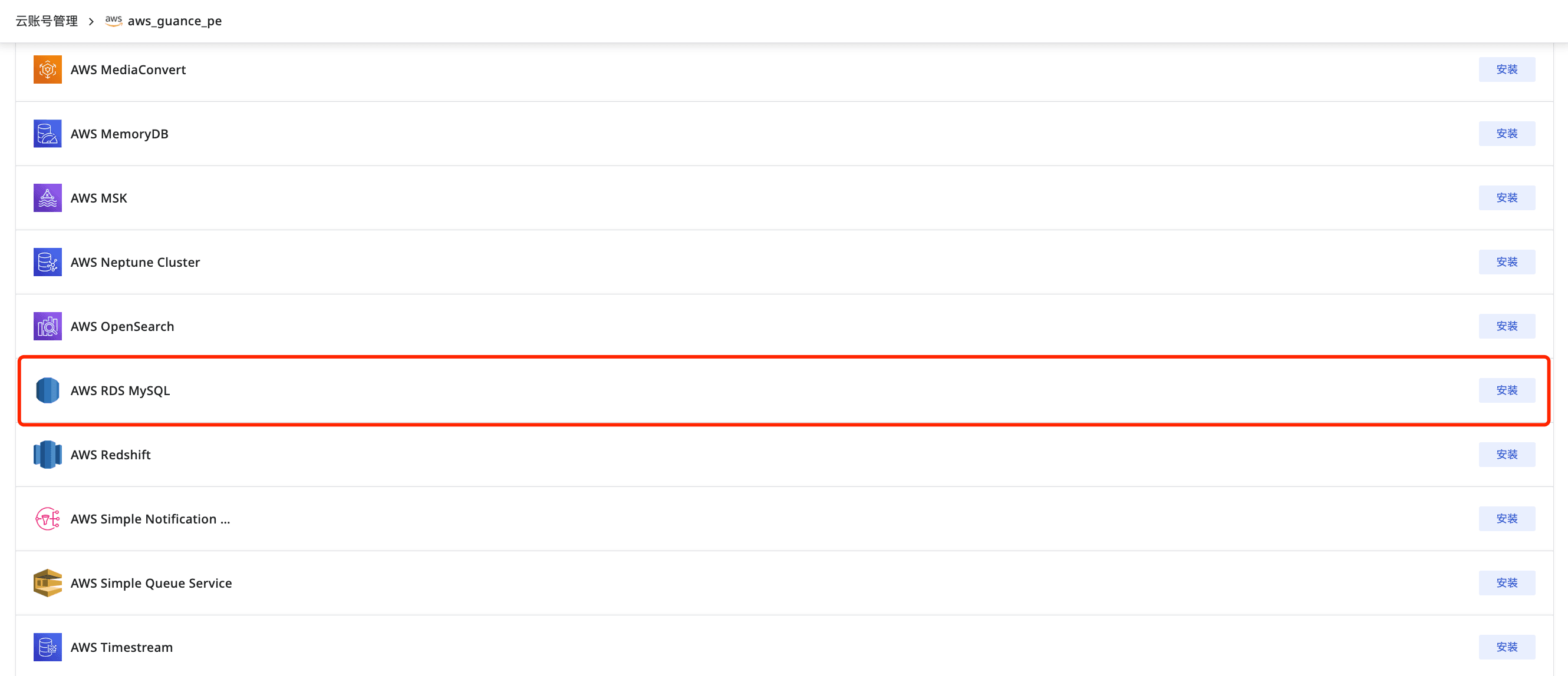 - 点击云账号详情页的【集成】按钮,在未安装列表下,找到AWS RDS Mysql,点击【安装】按钮,弹出安装界面安装即可。
