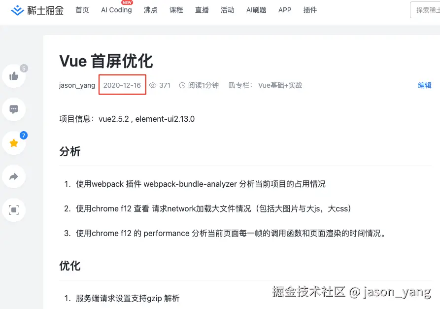 在老师网课指导下,接触了掘金这个平台。从第一篇《Vue 首屏优化》 开始。