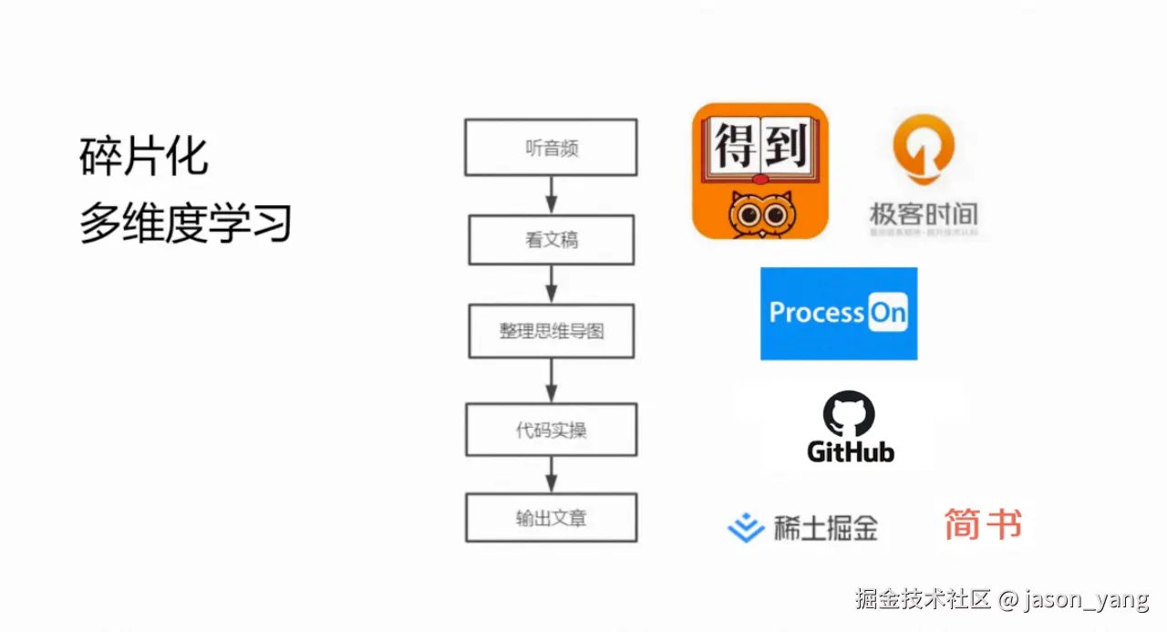 在信息大爆炸的时代,真的不缺学习的资源,得到,极客时间,慕课⽹,掘⾦。缺的是宝贵的注意力。 当然我们现在很难像学生那样 脱岗进行学习,才碎片化学习就是我们的选择。
