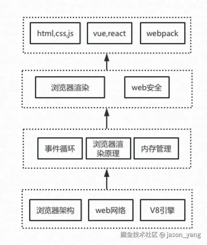 我们首要学习不是vue react 这些上层的东西。而是从底层的浏览器架构,再逐步学习中间的浏览器渲染原理-> 浏览器渲染 -> vue,react等