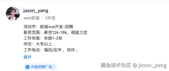 ** 招聘 ** 3年前通过掘金平台发布的沸点招聘信息,确实招到了一位前端开发。