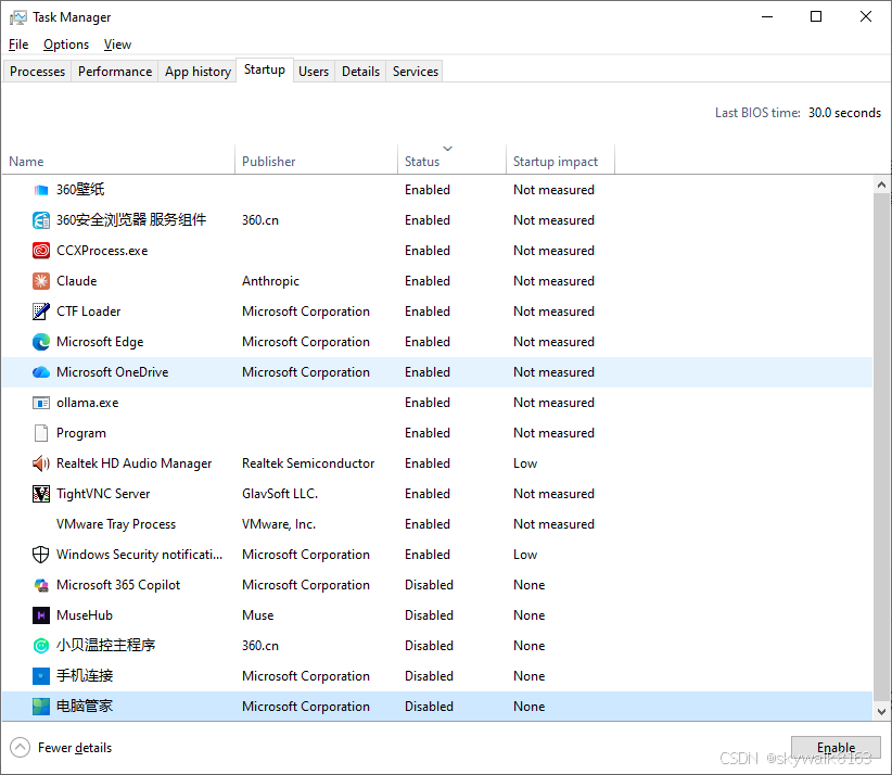 Ctrl + Shift + Esc打开"任务管理器"。 - 切换到"启动"选项卡。