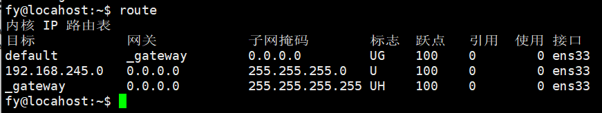 目标网段(Destination)、网关(Gateway)、子网掩码(Genmask)、标志(Flags)、跃点(Metric)、引用(Ref)、使用(Use)、出口网卡(Iface)。