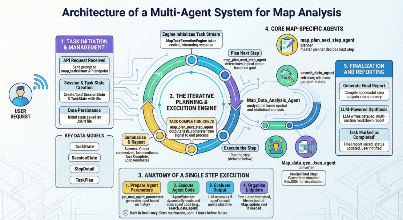 search_data_agent,Map_Data_Analysis_Agent)。MapTaskExecutionEngine作为调度中枢,根据LLM的规划动态组织这些智能体协同工作,模拟了一个专家团队的协作过程。 - 具备"记忆"与"容错"能力的流式执行引擎 :通过
