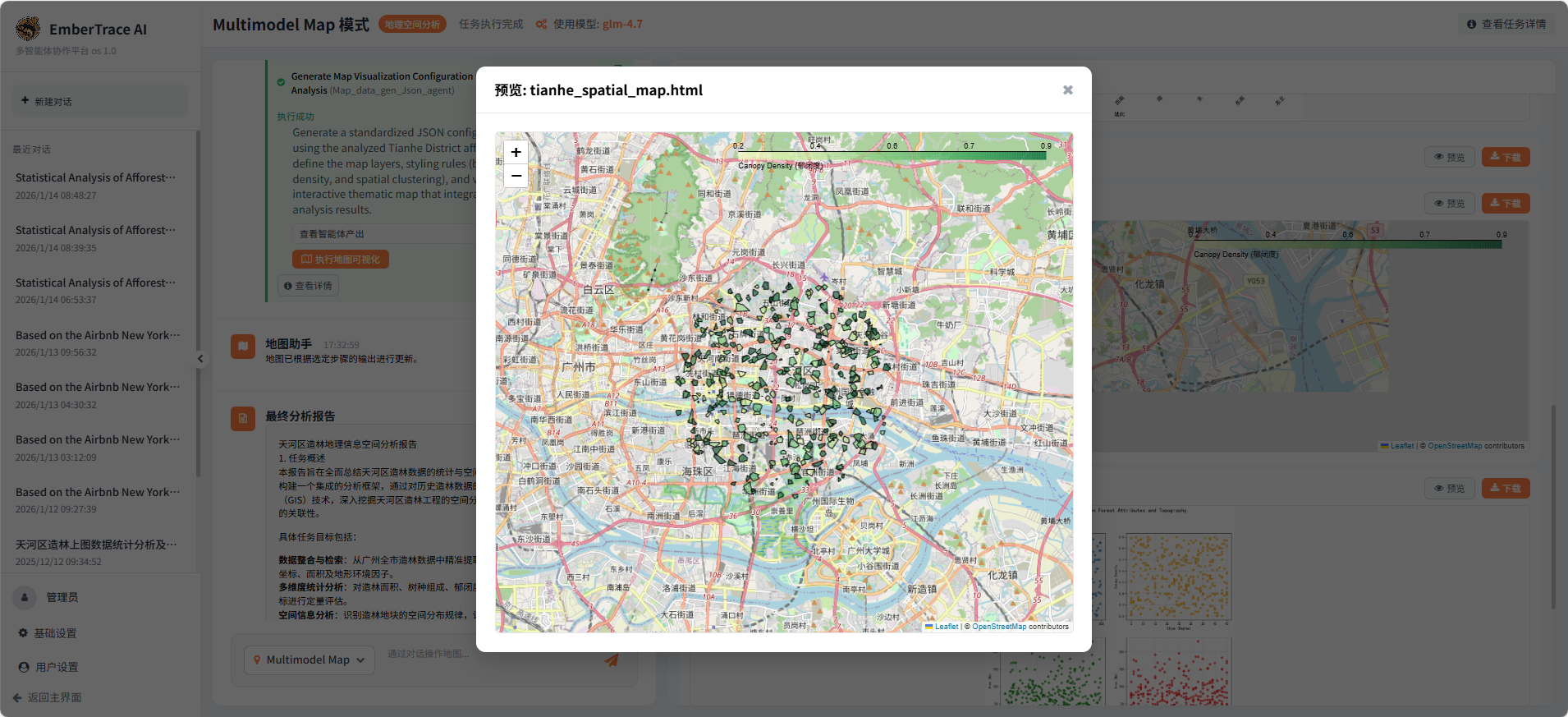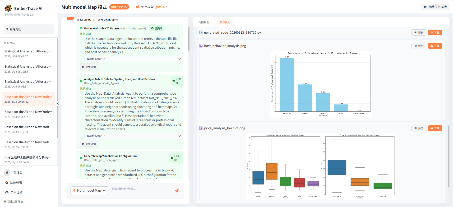 - 端到端的任务自动化 :平台能够理解用户如"分析纽约市Airbnb房源分布"或"统计天河区造林数据"的复杂意图,并自动完成从数据检索与清洗、空间统计与建模、到交互式地图可视化与报告生成的全流程闭环,真正实现了"一句话生成一幅分析地图"。