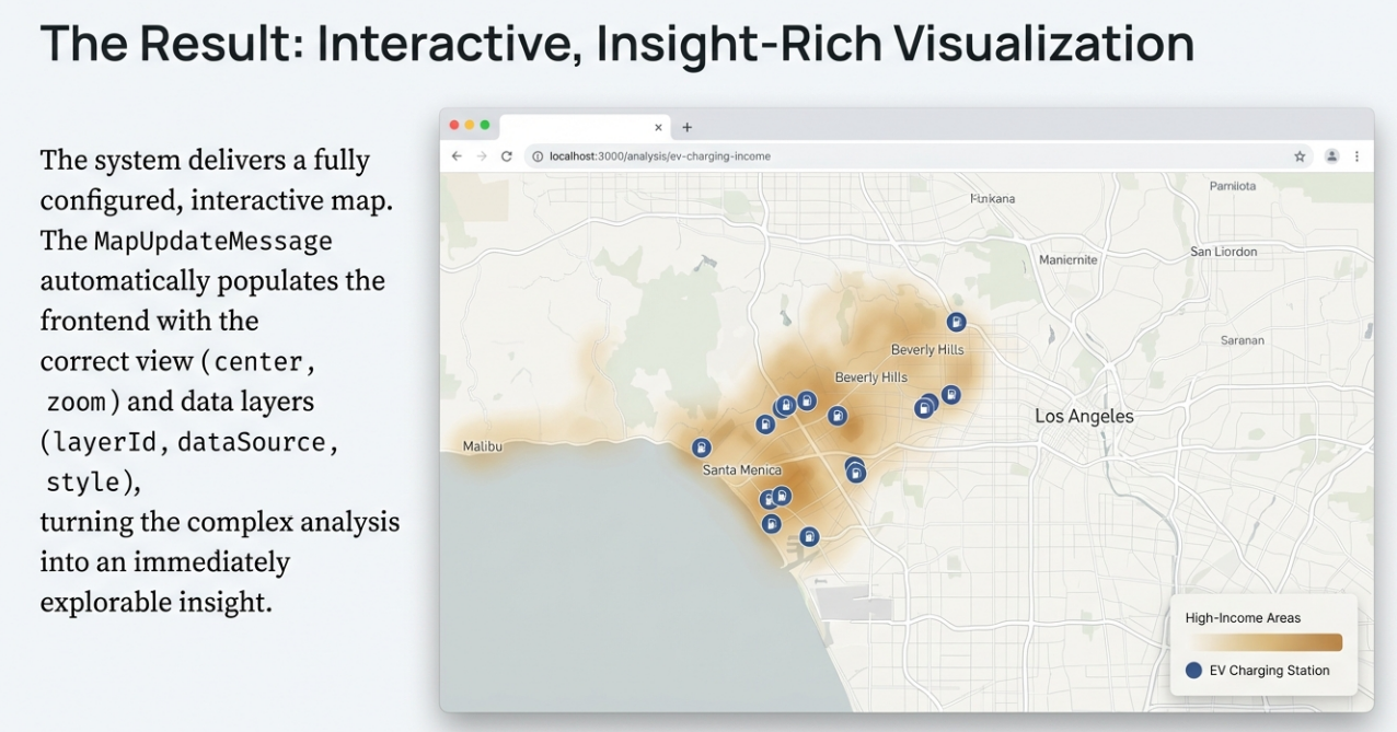 SessionState和TaskState实现任务状态的持久化管理,支持"断点续传"。执行引擎内嵌了"规划-执行-评估"闭环,当某一步骤输出不符合预期时,能自动利用LLM的反馈进行参数调整与重试,显著提升了复杂任务的成功率。 - 分析即配置的成果交付:系统强制要求最终步骤必须生成标准化地图配置(JSON),确保了分析成果能无缝、即时地转化为前端可渲染的交互式地图,实现了从分析过程到可视化产品的一键式交付。