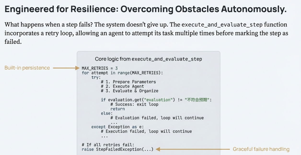 通过这种 LLM 驱动的迭代式规划模式,系统展现出了一种惊人的灵活性:如果数据检索失败,它会尝试更换搜索策略;如果分析结果不符合预期,它会调整参数重新执行。这种"思考-执行-反馈"的闭环,正是多智能体架构优于传统自动化脚本的关键所在。
